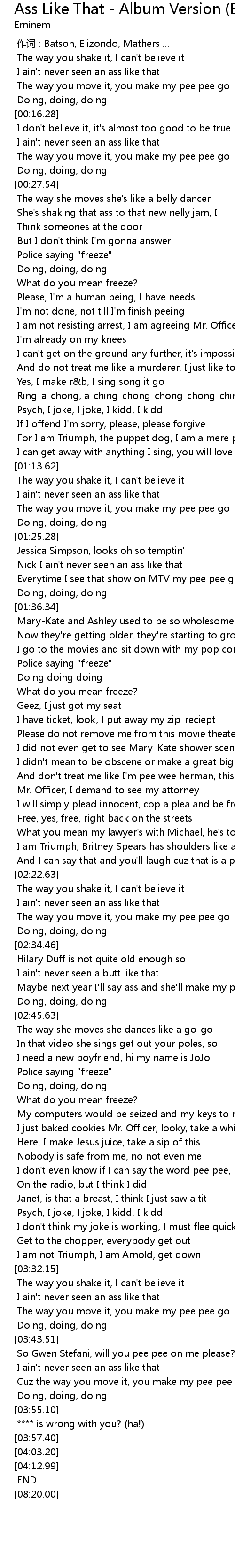| [02:40.62] | Maybe next year I' ll say ass and she' ll make my pee pee go |