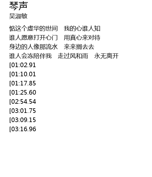 | [03:42.28][03:09.15][01:52.69] | 是谁人在弹琴 甘讲伊也有同款的心情 |