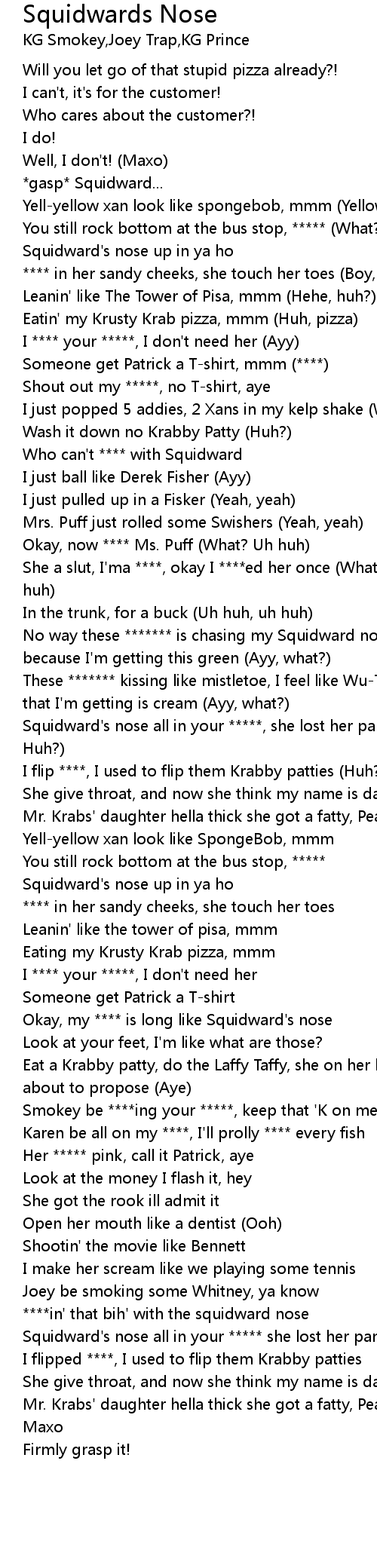 | [00:51.65] | Squidward's nose all in your *****, she lost her panties (What? Huh? Huh?) |