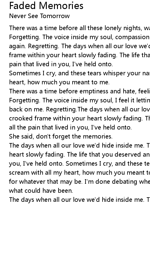 There was a time before all these lonely nights, washed away with innocence. Forgetting. The voice inside my soul, compassion letting go, leaving me alone again. Regretting. The days when all our love we'd hide inside me. The crooked frame within your heart slowly fading. The life that you deserved and all the pain that lived in you, I've held onto. |