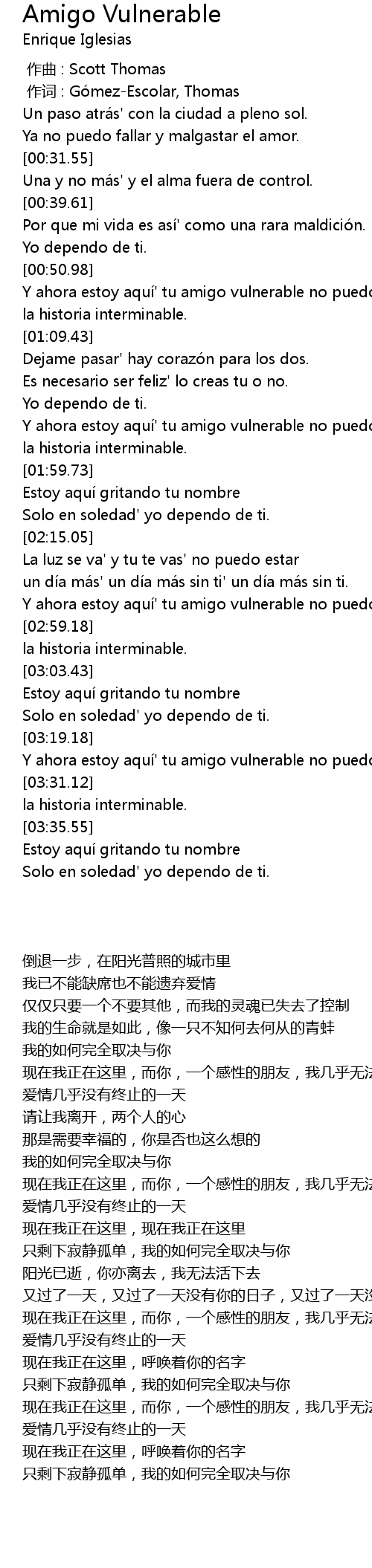 | [03:20.87] | Y ahora estoy aqui' tu amigo vulnerable no puedo seguir' |