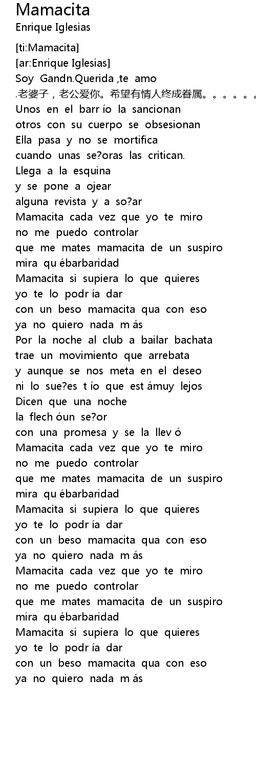 | [00:00.61] | Soy Gandn.Querida ,te amo .老婆子,老公爱你。希望有情人终成眷属。。。。。。 |