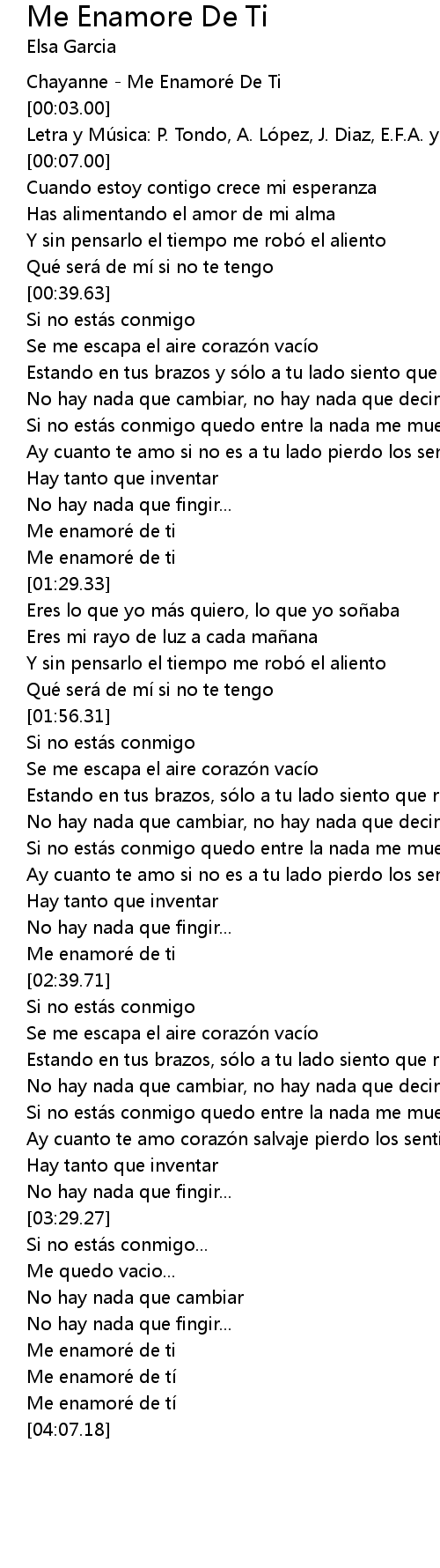 | [03:10.43] | Si no esta s conmigo quedo entre la nada me muero de fri o |