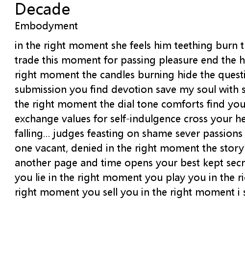 in the right moment she feels him teething burn the pictures of days gone by trade this moment for passing pleasure end the hour with even scores in the right moment the candles burning hide the question in one more thought with submission you find devotion save my soul with sudden good-byes falling... in the right moment the dial tone comforts find your peace beneath tainted sheets exchange values for self-indulgence cross your heart with fleeting dreams falling... judges feasting on shame sever passions on end children weeping for one vacant, denied in the right moment the story's ending try your soul on another page and time opens your best kept secrets plead the fifth now before you lie in the right moment you play you in the right moment you slay you in the right moment you sell you in the right moment i save you a decade late... |
