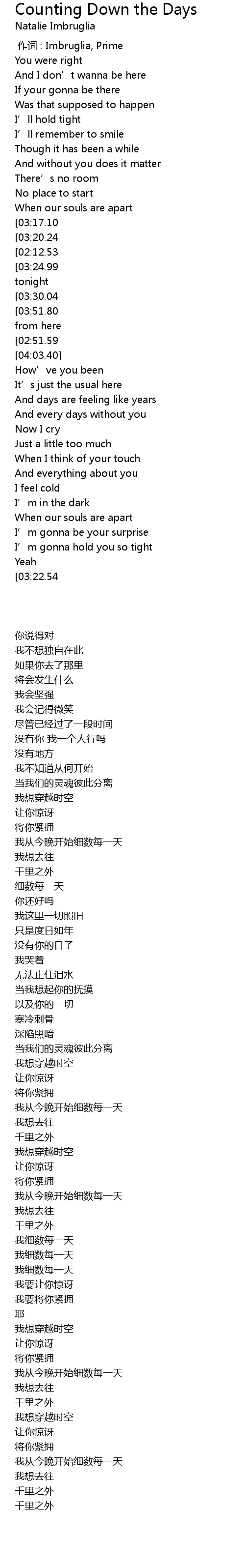 | [02:56.67][02:51.59][02:46.57][01:11.46] | I' m counting down the days |