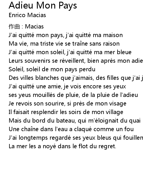 | Song | Adieu Mon Pays |
