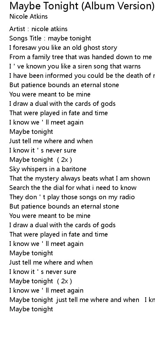 | [02:39.48] | Maybe tonight just tell me where and when I know it"s never true Maybe tonight |
