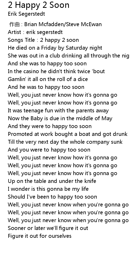| [00:02.11] | Songs Title: 2 happy 2 soon |