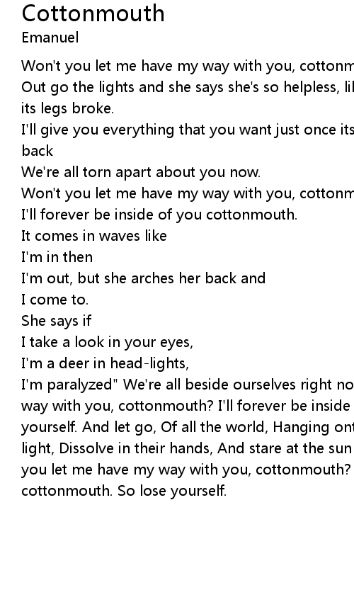 I'm paralyzed" We're all beside ourselves right now. Won't you let me have my way with you, cottonmouth? I'll forever be inside of you cottonmouth. So lose yourself. And let go, Of all the world, Hanging onto you, An image of white light, Dissolve in their hands, And stare at the sun until you go blind. Won't you let me have my way with you, cottonmouth? I'll forever be inside of you cottonmouth. So lose yourself. |