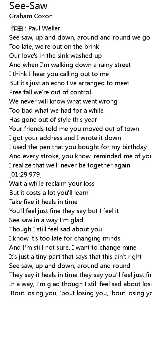 | [01:53.593] | See saw in a way I' m glad |