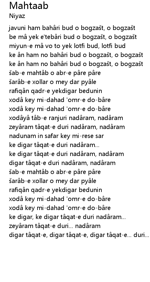 | zeyâram tâqat-e duri nadâram, nadâram | |