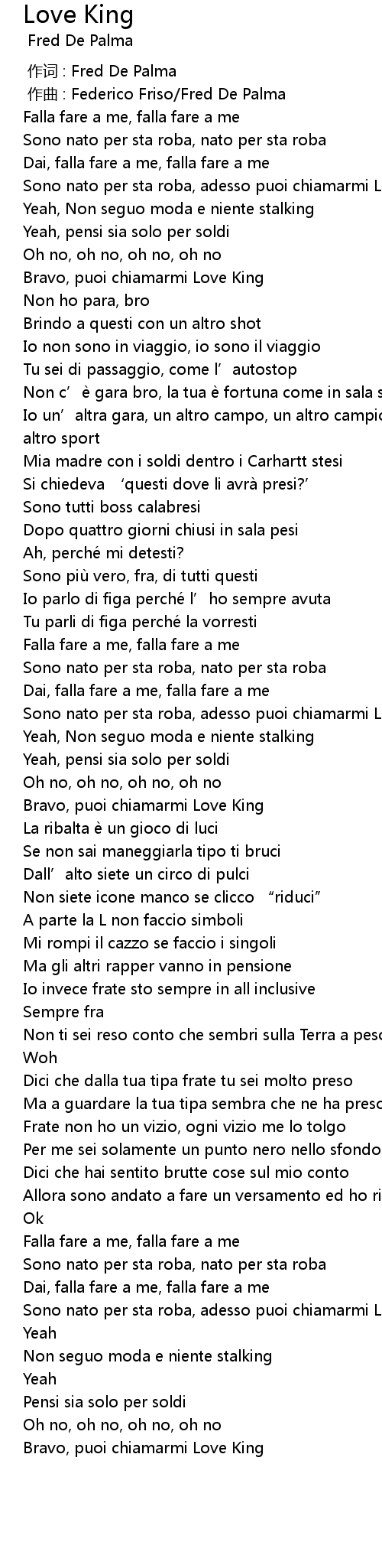 | [02:36.644] | Sono nato per sta roba, adesso puoi chiamarmi Love King |