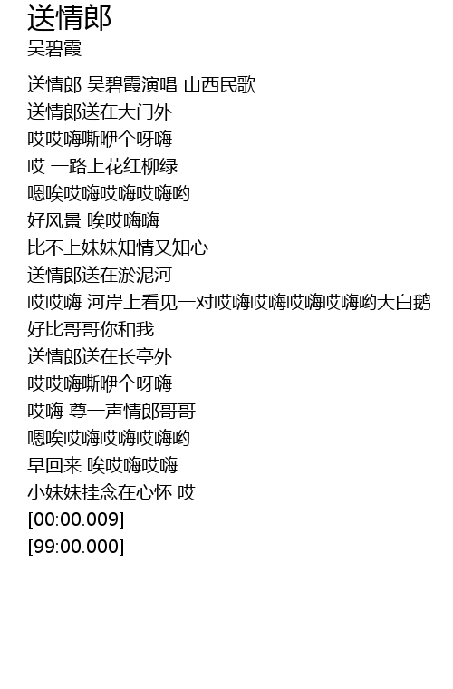 | [00:06.26] | 送情郎 吴碧霞演唱 山西民歌 |