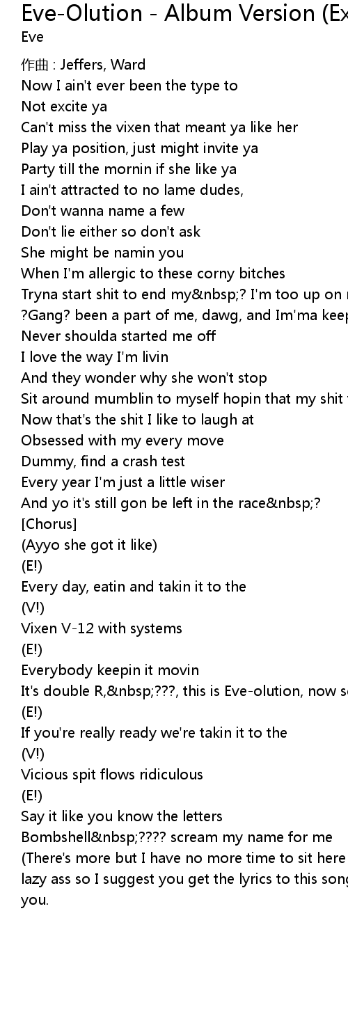 | lazy ass so I suggest you get the lyrics to this song so I can have them. Thank | |