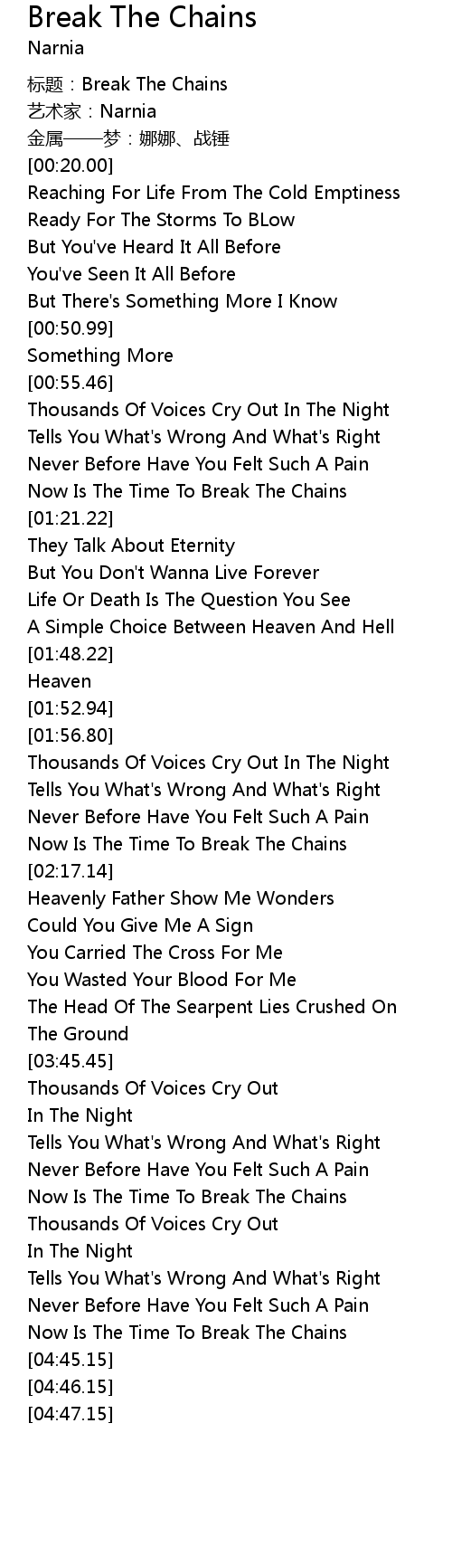 | [04:36.13] | Now Is The Time To Break The Chains |