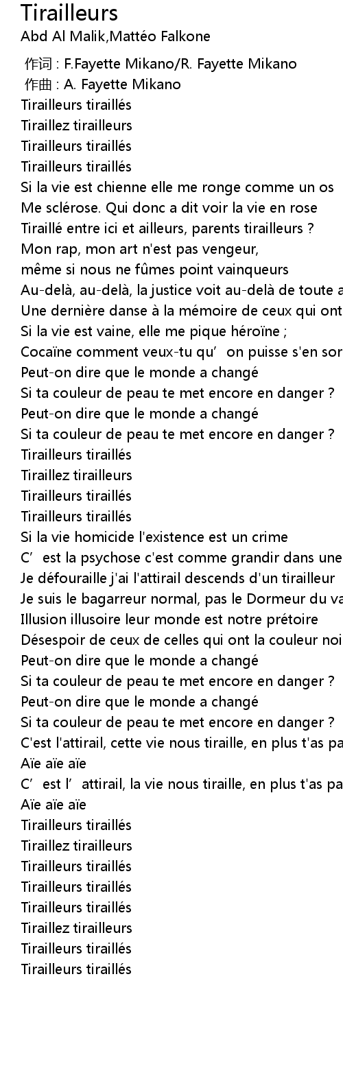 | [01:19.50] | Je dé fouraille j' ai l' attirail descends d' un tirailleur |
