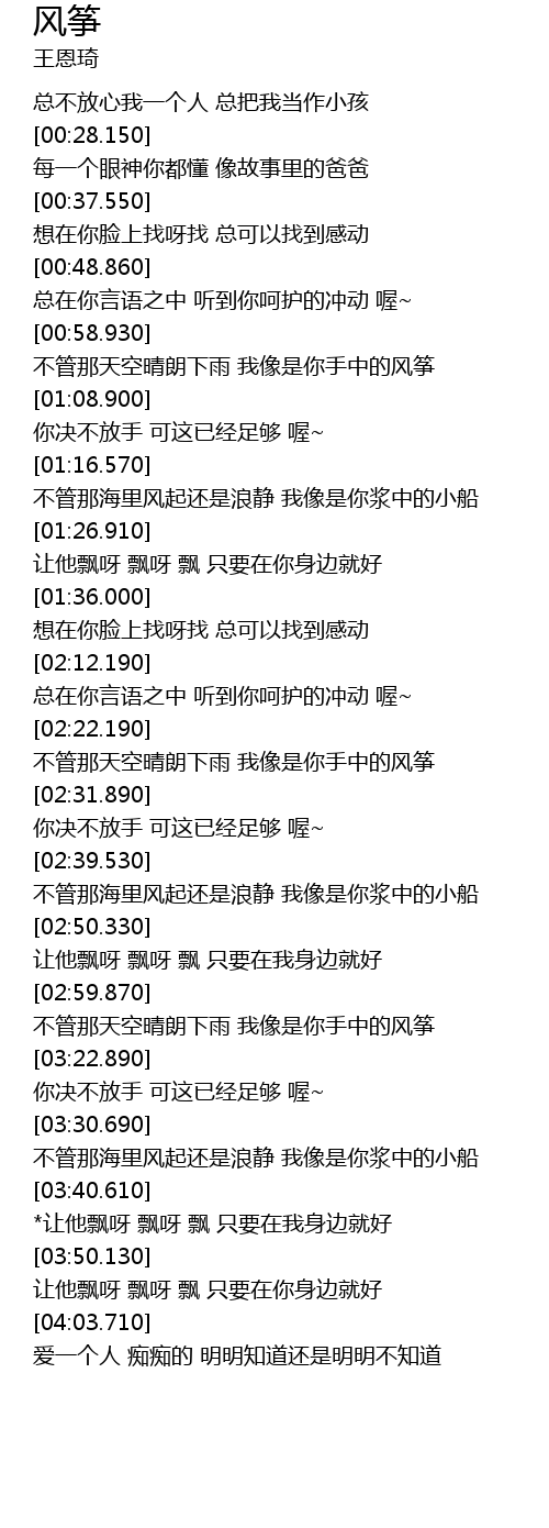 | [03:57.860] | 让他飘呀 飘呀 飘 只要在你身边就好 |