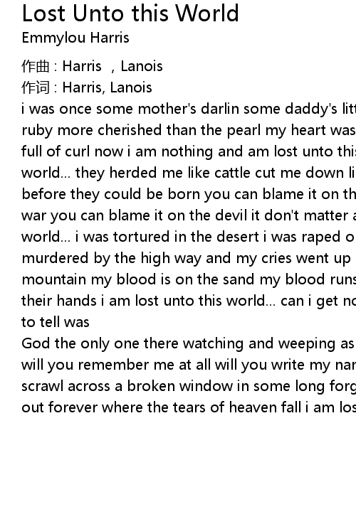 | i was once some mother' s darlin some daddy' s little girl more precious than the ruby more cherished than the pearl my heart was full of mercy and my forehead full of curl now i am nothing and am lost unto this world i am lost unto this world... they herded me like cattle cut me down like corn took me from my babies before they could be born you can blame it on the famine you can blame it on the war you can blame it on the devil it don' t matter anymore i am lost unto this world... i was tortured in the desert i was raped out on the plain i was murdered by the high way and my cries went up in vain my blood is on the mountain my blood is on the sand my blood runs in the river that now washes thru their hands i am lost unto this world... can i get no witness this unholy tale to tell was | |
