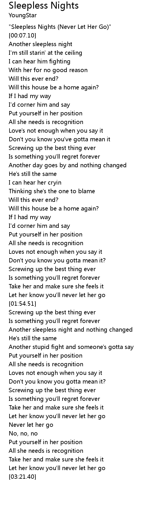 | [00:02.00] | "Sleepless Nights (Never Let Her Go)" |