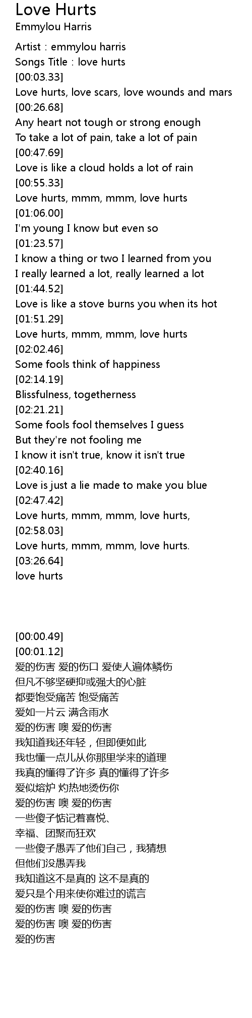 | [01:53.18] | Love hurts, mmm, mmm, love hurts |