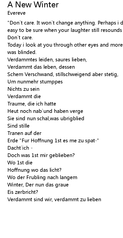 | "Don`t care. It won`t change anything. Perhaps i don`t care, but it`s not that easy to be sure when your laughter still resounds in my ears. " | |