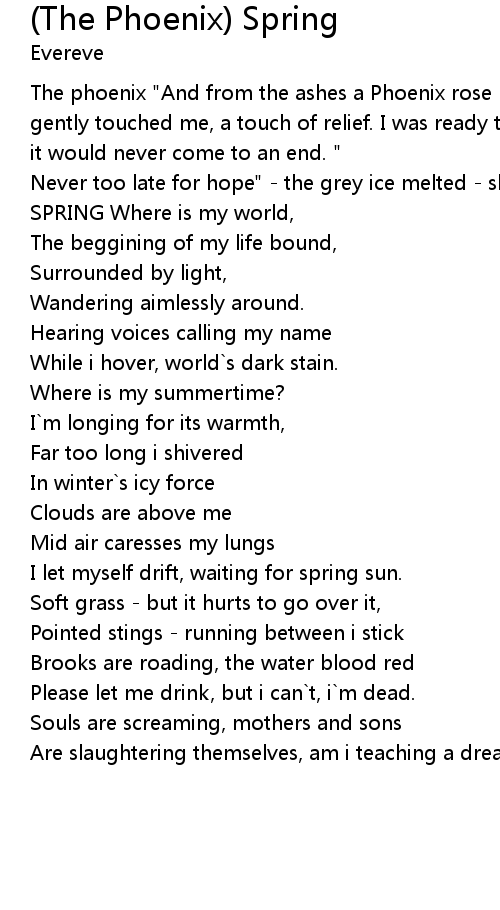| The phoenix "And from the ashes a Phoenix rose - with wings made of gold it gently touched me, a touch of relief. I was ready to start a new circle, hoping it would never come to an end. " | |