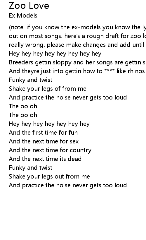(note: if you know the ex-models you know the lyrics are pretty hard to figure out on most songs. here's a rough draft for zoo love. i know these are mostly, really wrong, please make changes and add until it seems right.) |