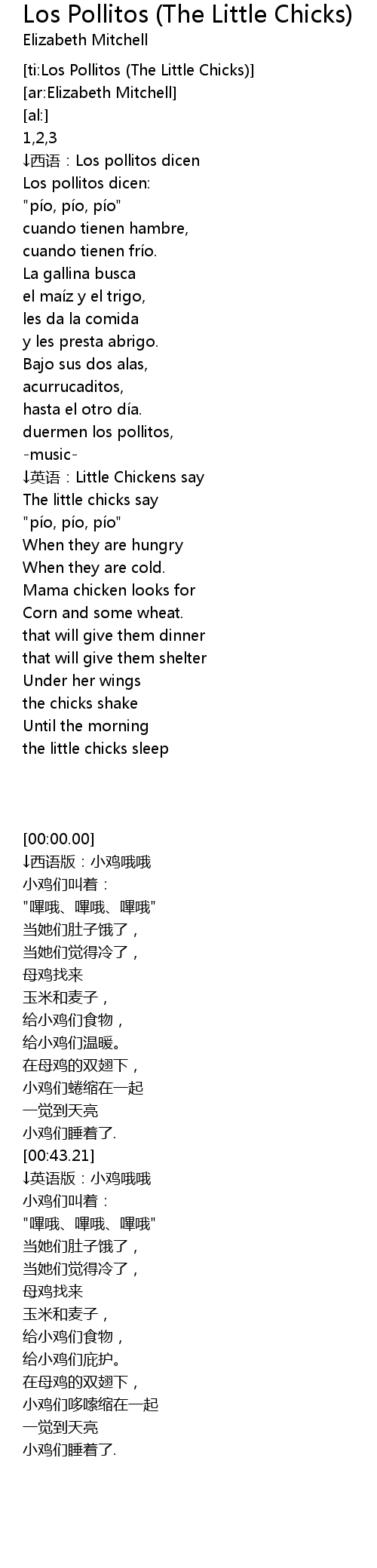 | [00:04.29] | ↓西语:Los pollitos dicen |