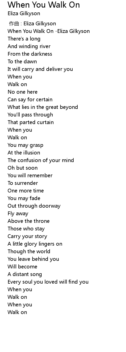 | [00:00.397] | When You Walk On -Eliza Gilkyson |