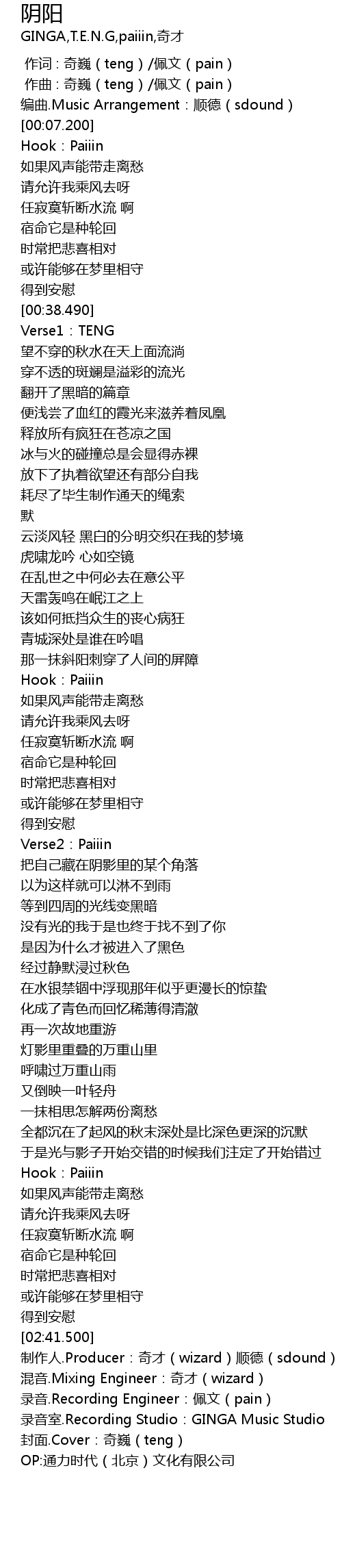 | [02:44.280] | hun yin. Mixing Engineer: qi cai wizard |