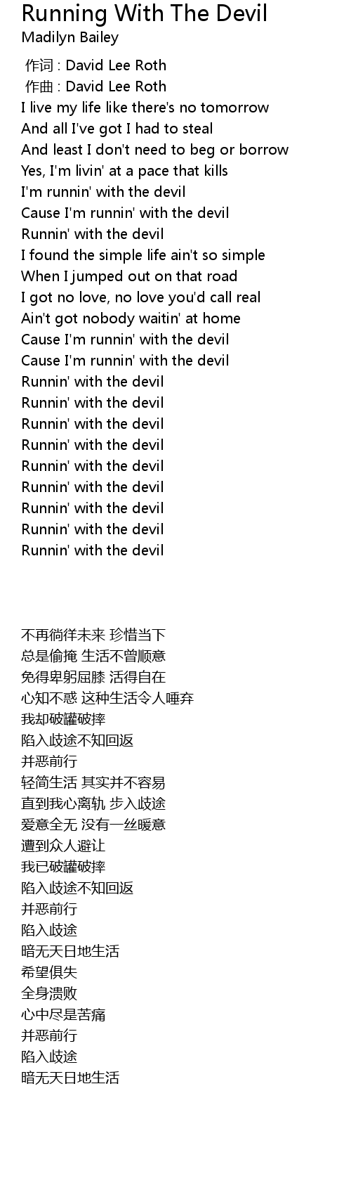 | [00:42.305] | Cause I' m runnin' with the devil |