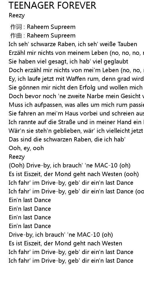 | [01:30.58] | Ich fahr' im Drive-by, geb' dir ein'n last Dance (ooh) |