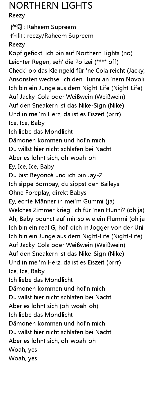 | [00:21.85] | Kopf gefickt, ich bin auf Northern Lights no |