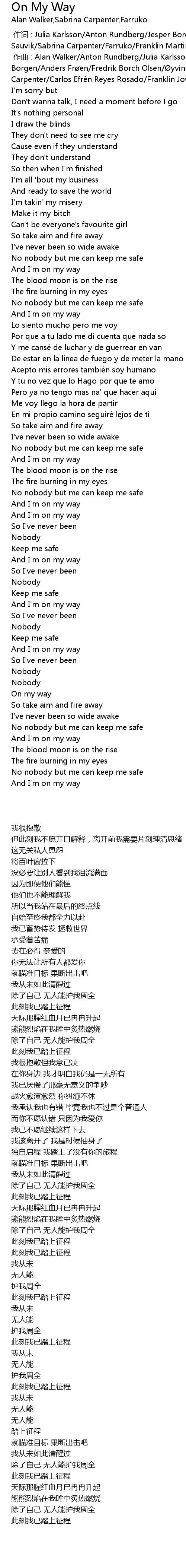 | [00:00.022] | 作曲 : Alan Walker/Anton Rundberg/Julia Karlsson/Jesper Borgen/Anders Frøen/Fredrik Borch Olsen/Øyvind Sauvik/Gunnar Greve/Sabrina Carpenter/Carlos Efrén Reyes Rosado/Franklin Jovani Martinez/Marcos G Perez |