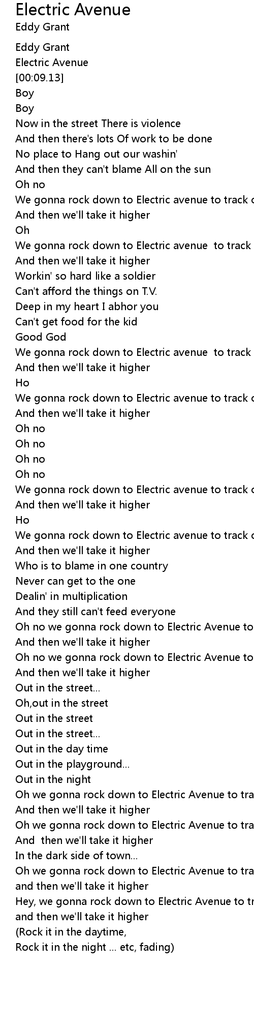 Oh no we gonna rock down to Electric Avenue to track of you |