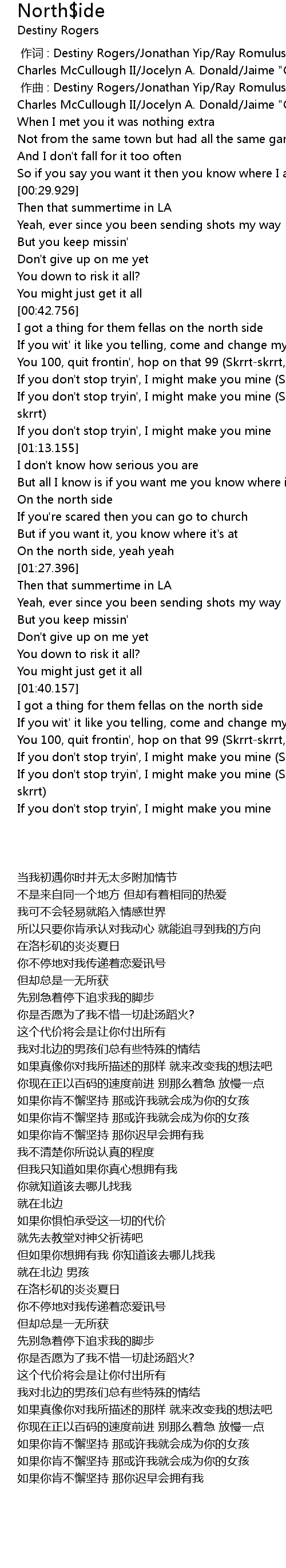 | [00:00.000] | 作词 : Destiny Rogers/Jonathan Yip/Ray Romulus/Jeremy Reeves/Ray Charles McCullough II/Jocelyn A. Donald/Jaime "CA$HPASSION" Lepe |