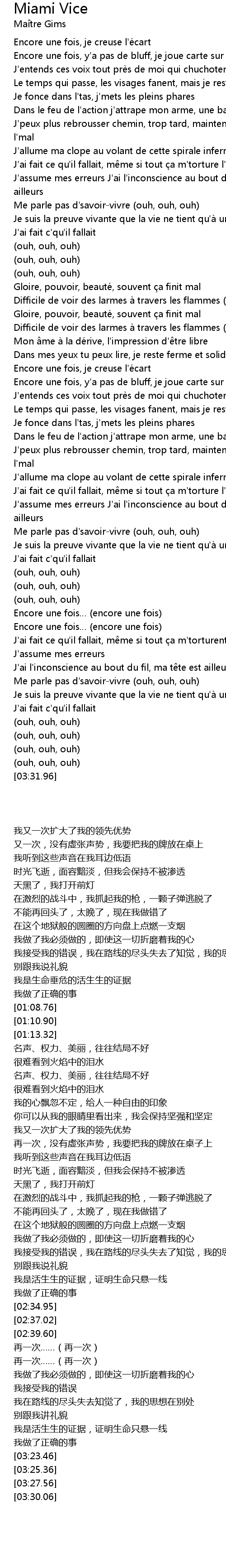 | [01:19.38] | Difficile de voir des larmes a travers les flammes ouh, ouh, ouh |