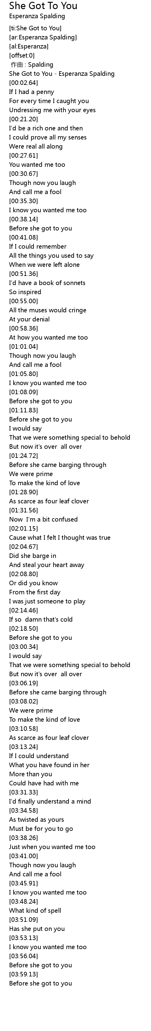 | [00:01.25] | She Got to You Esperanza Spalding |
