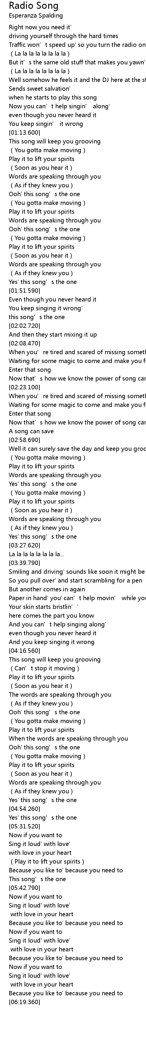 | [00:36.600] | Traffic won' t speed up' so you turn the radio on |