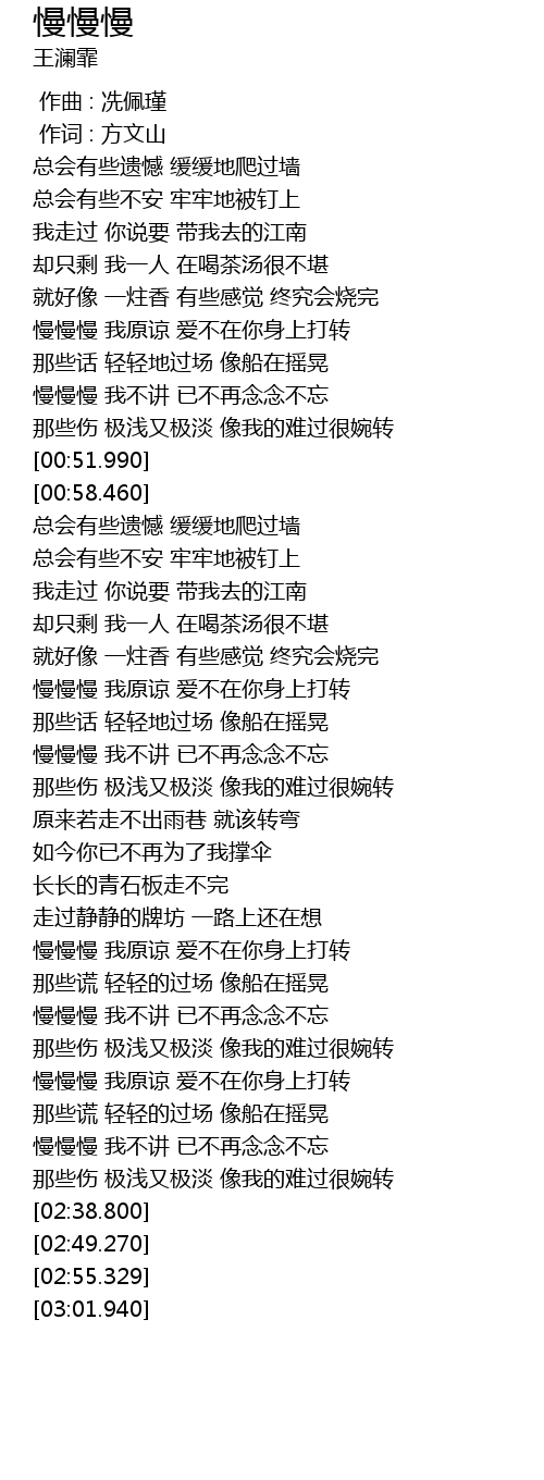 | [02:10.280] | 慢慢慢 我不讲 已不再念念不忘 |