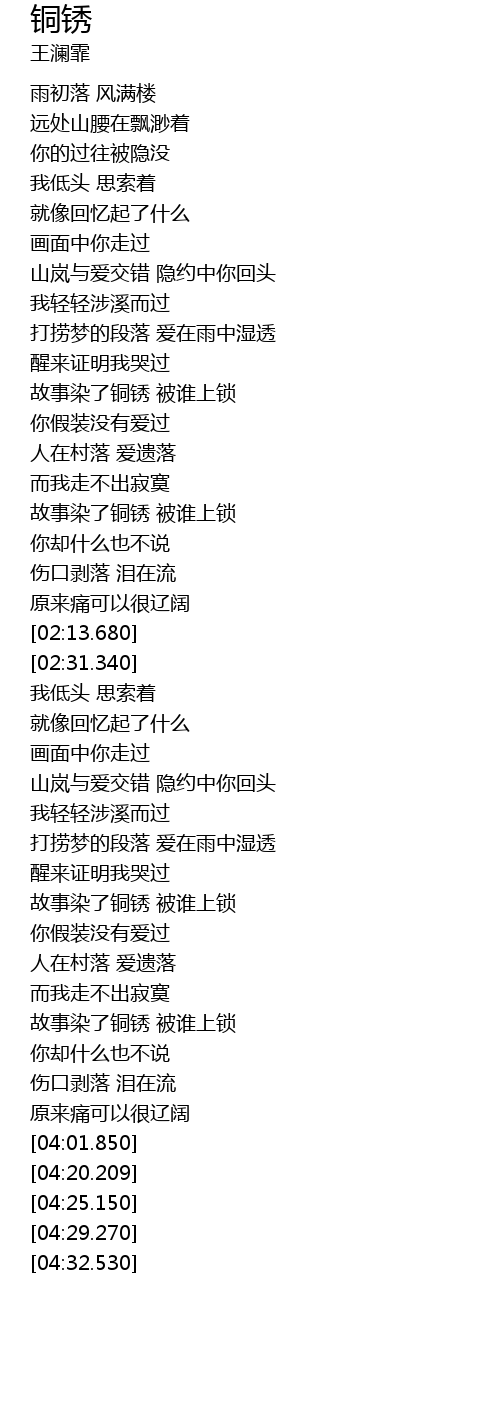 | [03:15.540] | 故事染了铜锈 被谁上锁 |