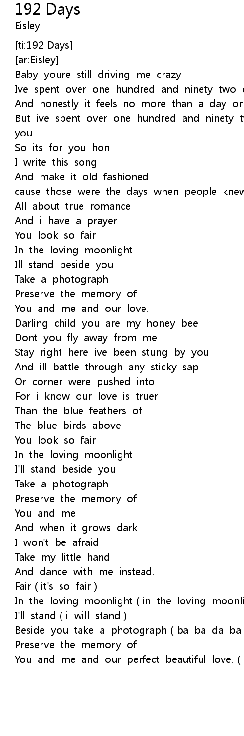 | [00:21.54] | But ive spent over one hundred and ninety two days loving you. |