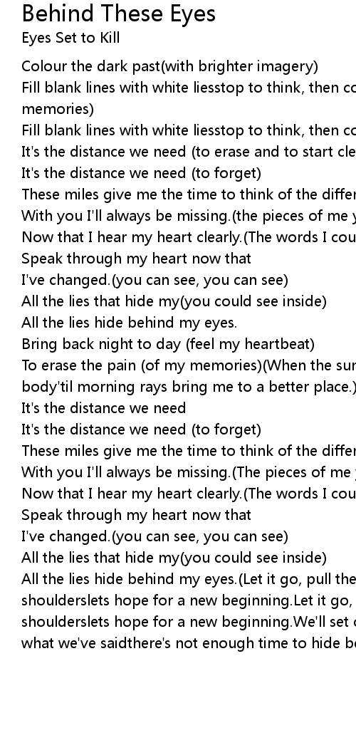 All the lies hide behind my eyes.(Let it go, pull the weight off my shoulderslets hope for a new beginning.Let it go, pull the weight off my shoulderslets hope for a new beginning.We'll set our feelings aside and forget what we've saidthere's not enough time to hide behind these eyes of regret.) |