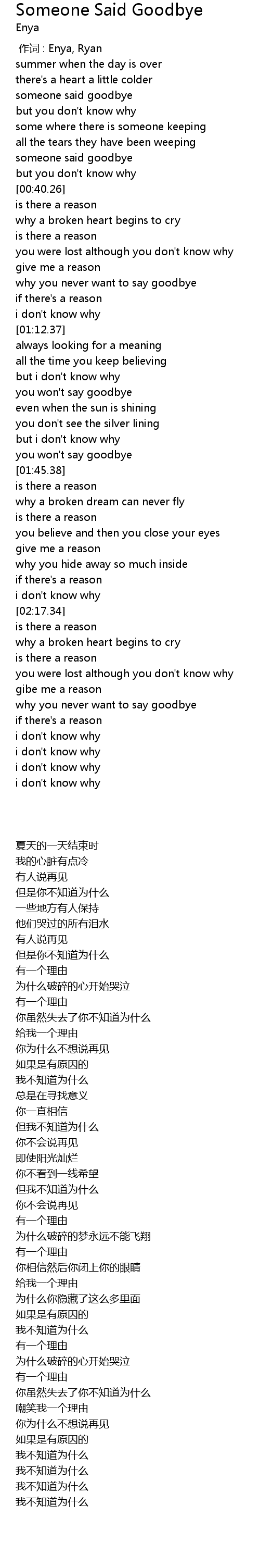| [00:00.00] | zuò cí : Enya, Ryan |