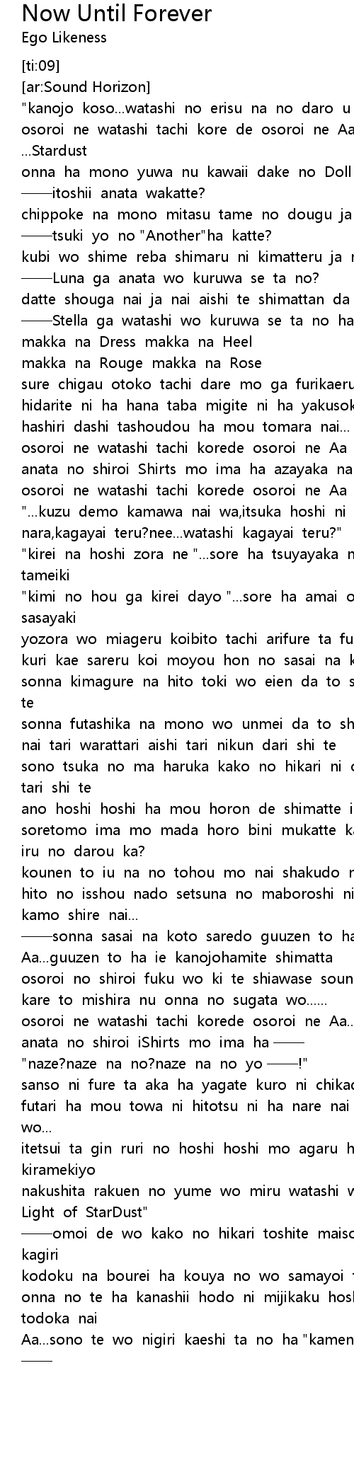 | [03:38.691] | nakushita rakuen no yume wo miru watashi wo michibike "The Light of StarDust" |