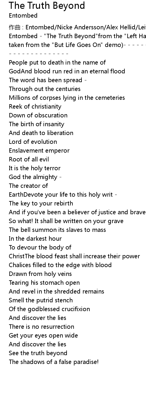 | Entombed " The Truth Beyond" from the " Left Hand Path" album 1989 These words taken from the " But Life Goes On" demo | |