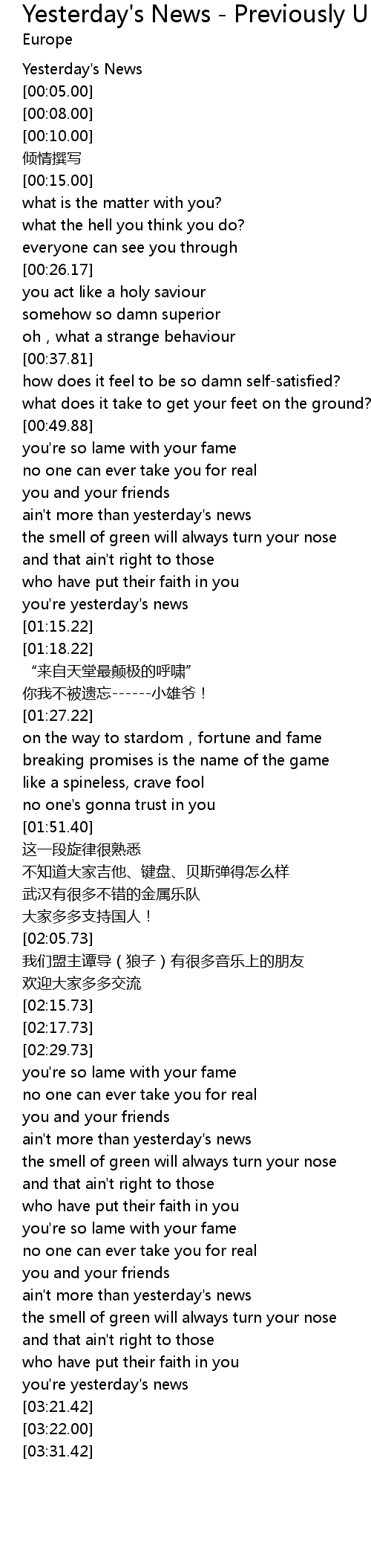 | [00:01.00] | Yesterday's News |