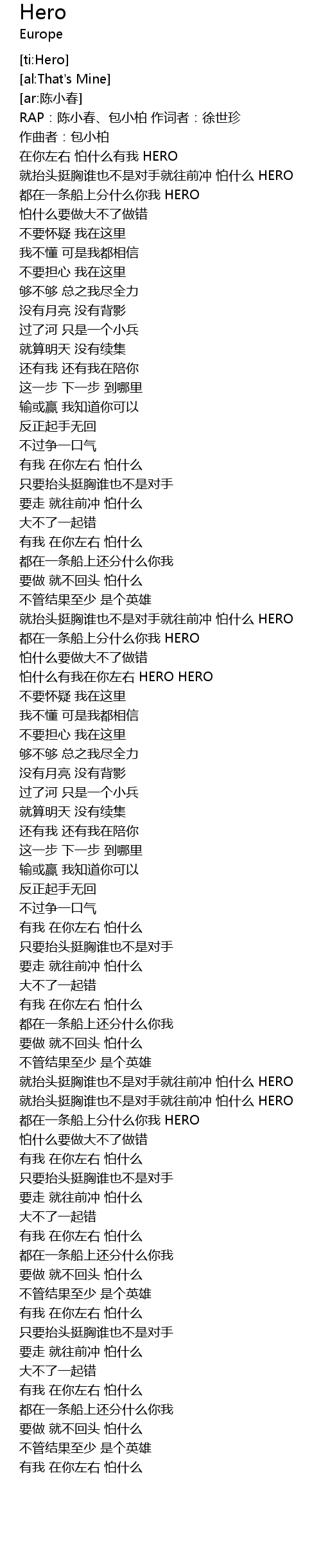 | [01:53.570] | pà shén me yǒu wǒ zài nǐ zuǒ yòu HERO HERO |
