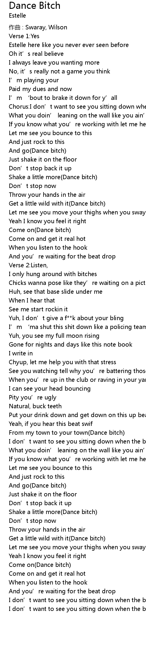 | I don’t want to see you sitting down when the beat drops, now(Dance bitch) x 8 |