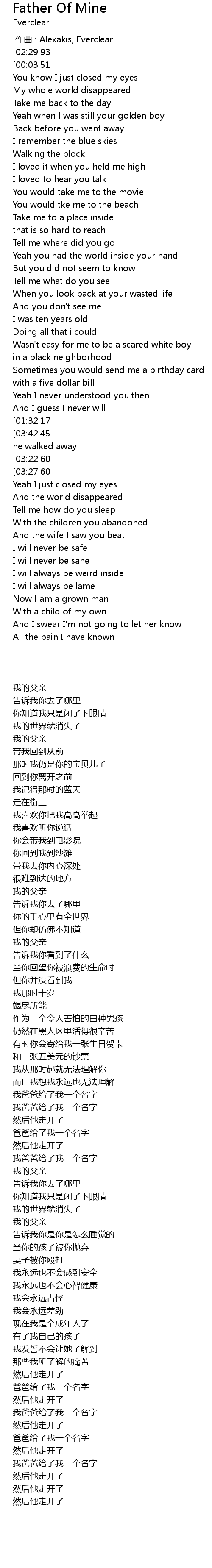 | [02:40.61][02:29.93][01:00.87][00:49.66][00:11.19][00:00.95] | Father of mine |
